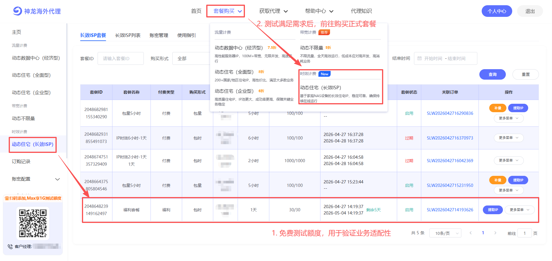 1. 购买代理IP:神龙海外动态长效ISP支持免费试用,注册登录后系统将自动发放测试额度,完成实名认证后即可提取使用。若测试满足需求,可前往【套餐购买】——【动态住宅(长效ISP)】页面选购正式套餐。