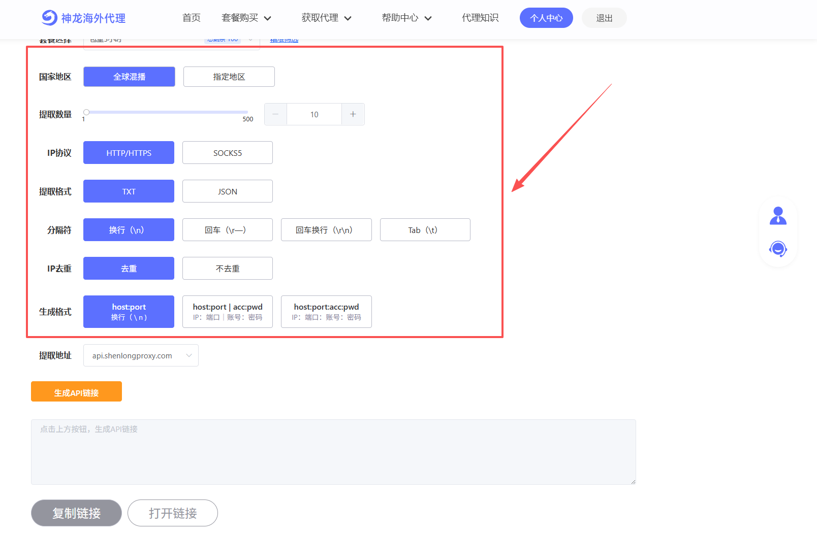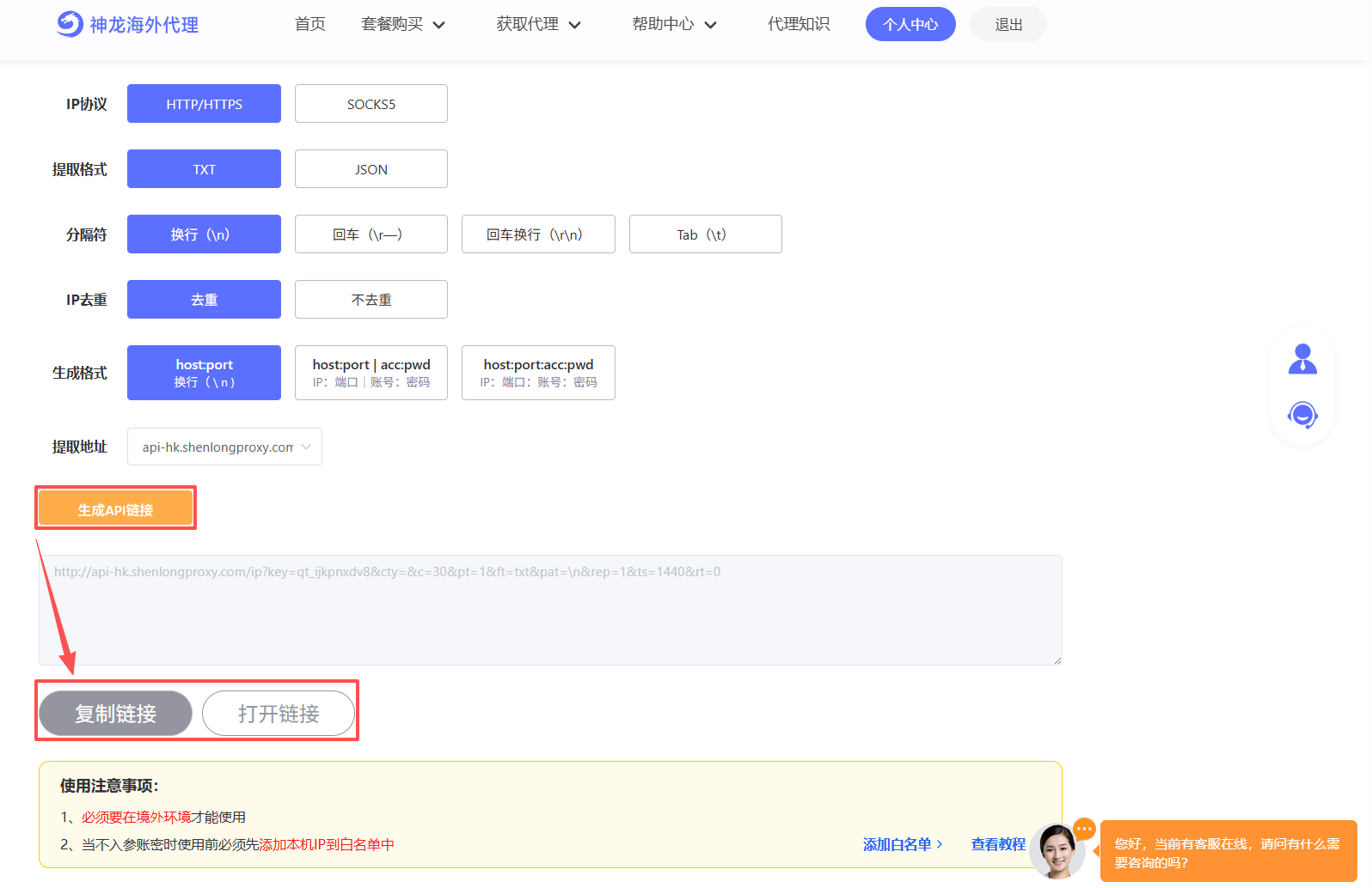 参数配置完成后,点击【生成API链接】,系统将自动生成对应的API地址。您可点击【复制链接】用于后续代理配置,或直接访问该链接查看当前提取到的IP地址,便于管理与使用。