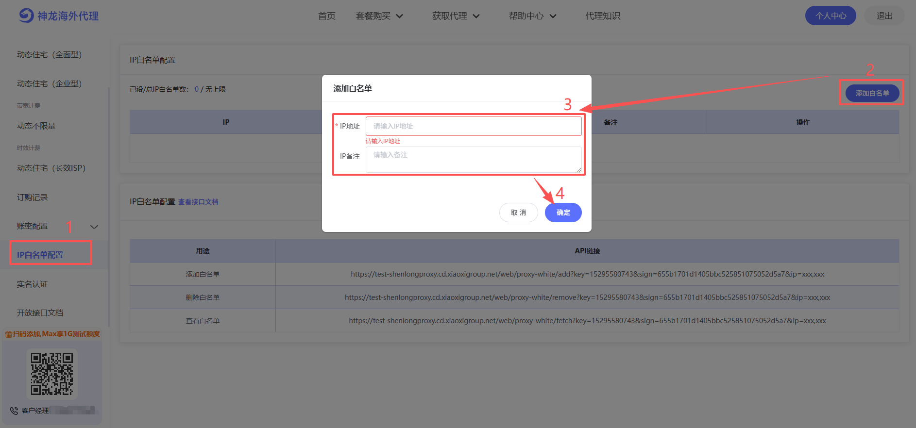 前往【IP白名单配置】页面,点击【添加白名单】,在弹窗中填写需要使用代理的设备或服务器IP地址至【IP地址】处;如需便于后续管理,可在【IP备注】处填写说明信息。确认无误后,点击【确定】即可完成添加。