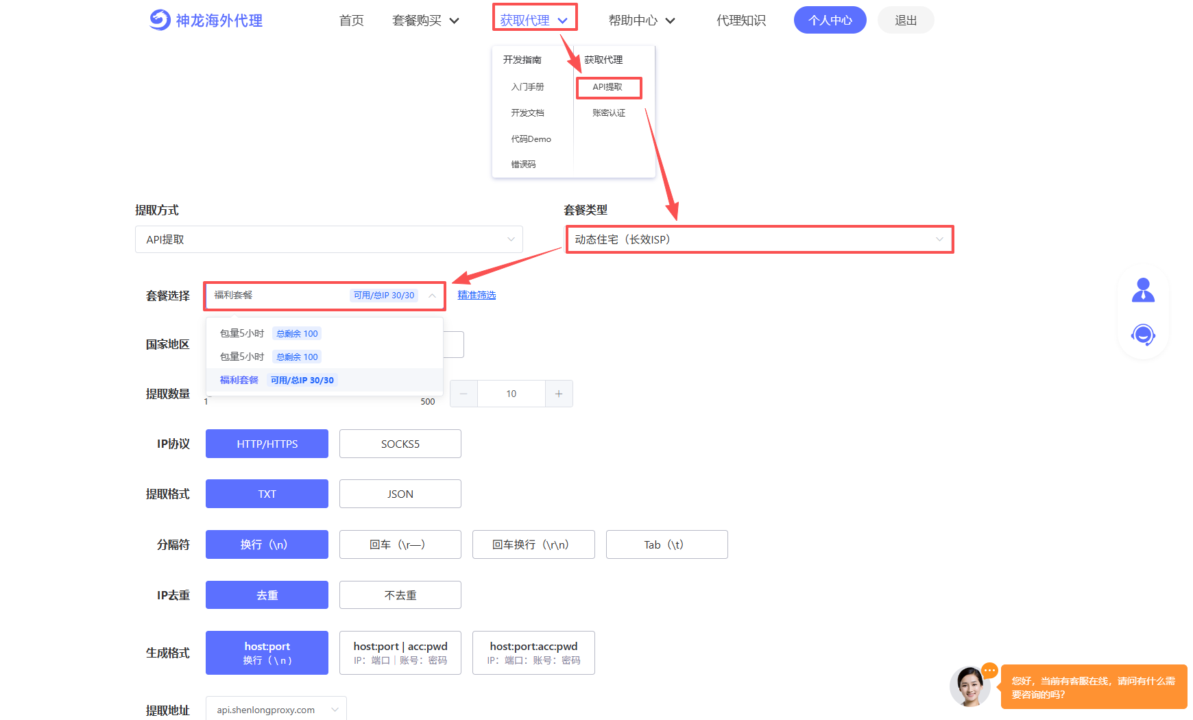 1)选择套餐:点击【获取代理】——【API提取】,【套餐类型】选择为“动态住宅(长效ISP)”,并在【套餐选择】中筛选对应使用的套餐。
