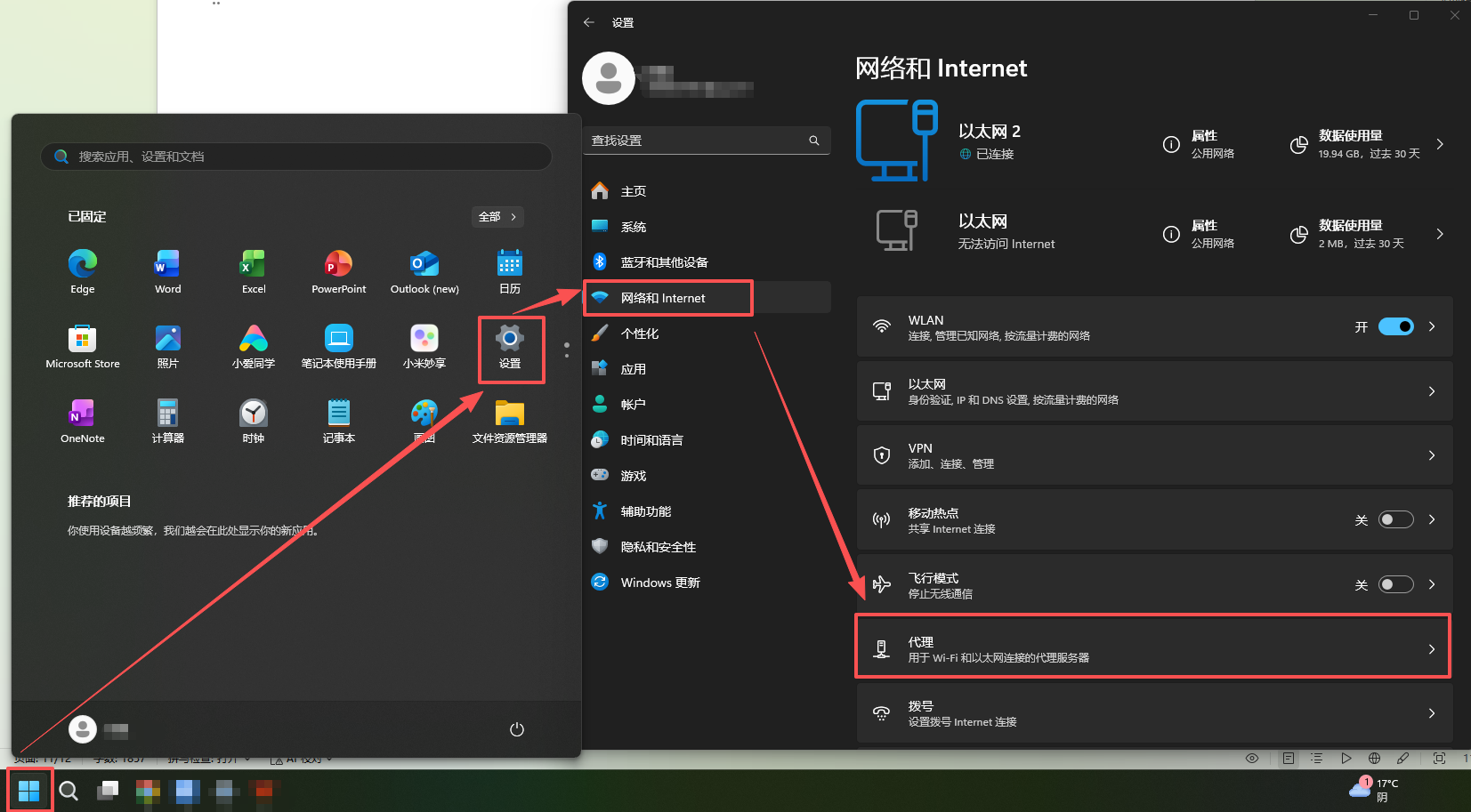 ① 操作路径:打开电脑,点击【开始】——【设置】——【网络和 Internet】——【代理】