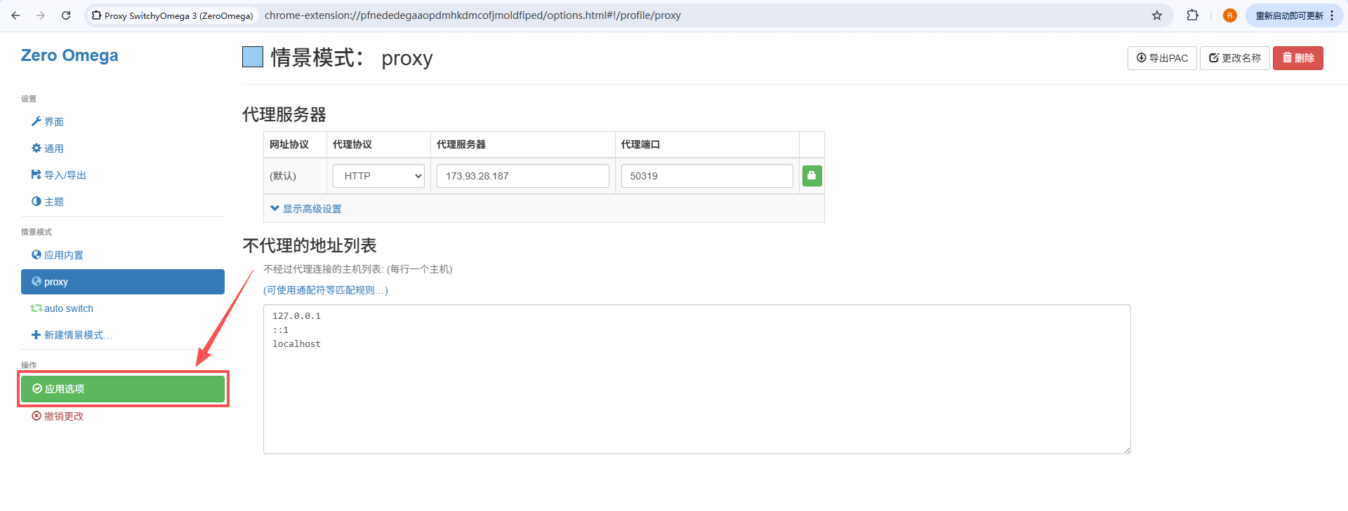 c. 应用代理:完成以上代理信息配置后,点击【应用选项】,使当前代理配置生效。