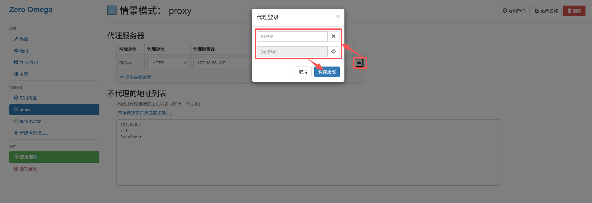 b. 配置认证信息:API模式自此已完成基础代理配置。若使用账密模式,需继续点击【认证】按钮,在【用户名】与【密码】字段中填写神龙海外提供的账号与密码,确认无误后点击【保存更改】即可完成配置。