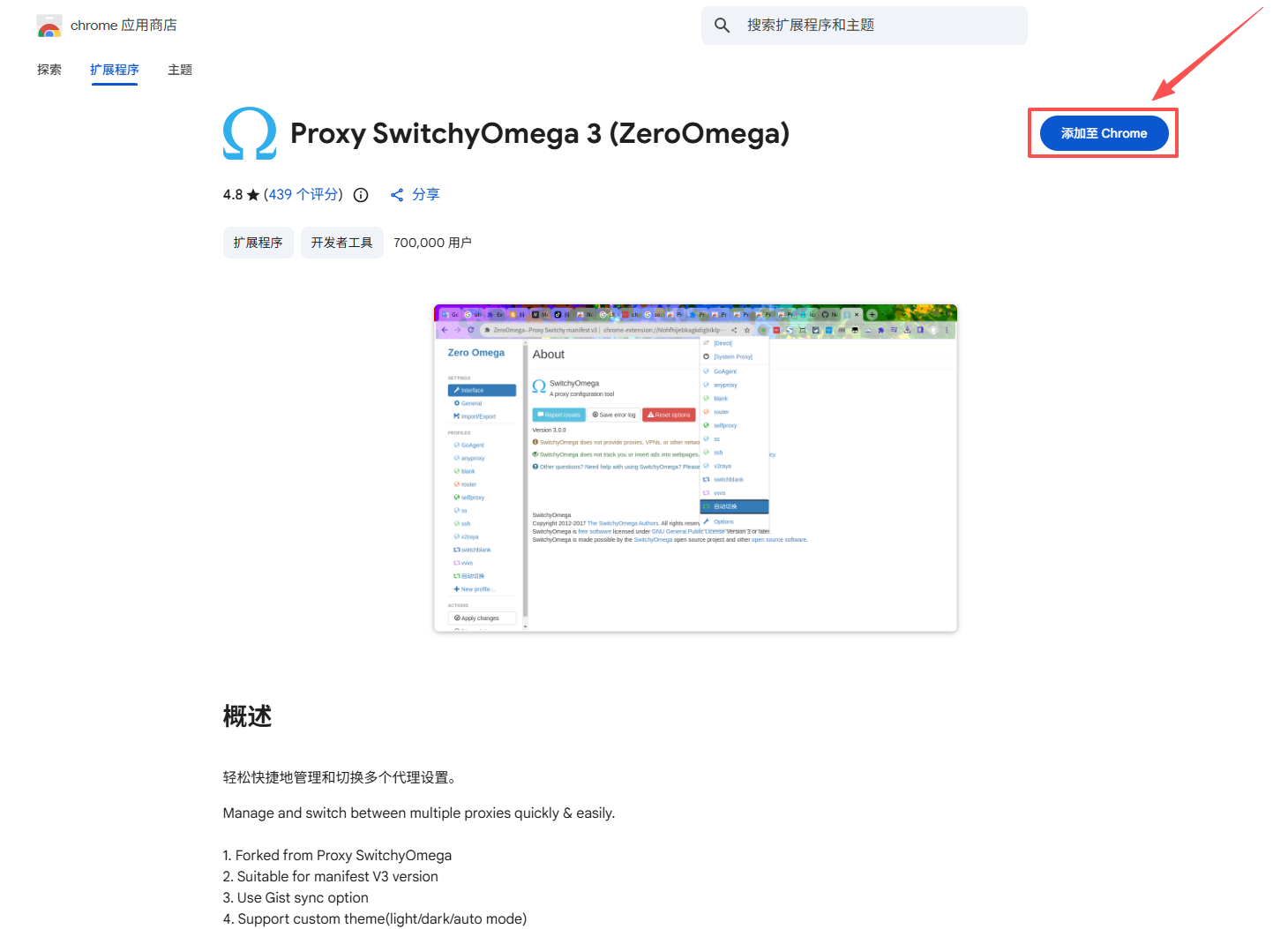在谷歌浏览器中安装常用代理插件(例如 SwitchyOmega),您可前往“谷歌应用商店”搜索,并点击【添加至 Chrome】即可。