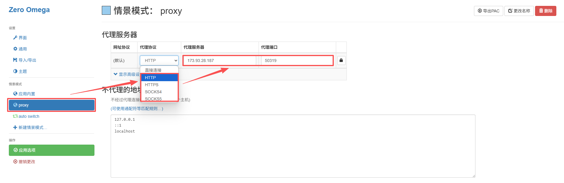 a. 填写IP和端口:安装后会自动进入插件设置页面,点击【proxy】(也可通过【新建情景模式】创建多个代理配置),将【代理协议】选择为 HTTP 或 HTTPS,并将神龙海外提供的代理地址、代理端口分别填写至对应字段。