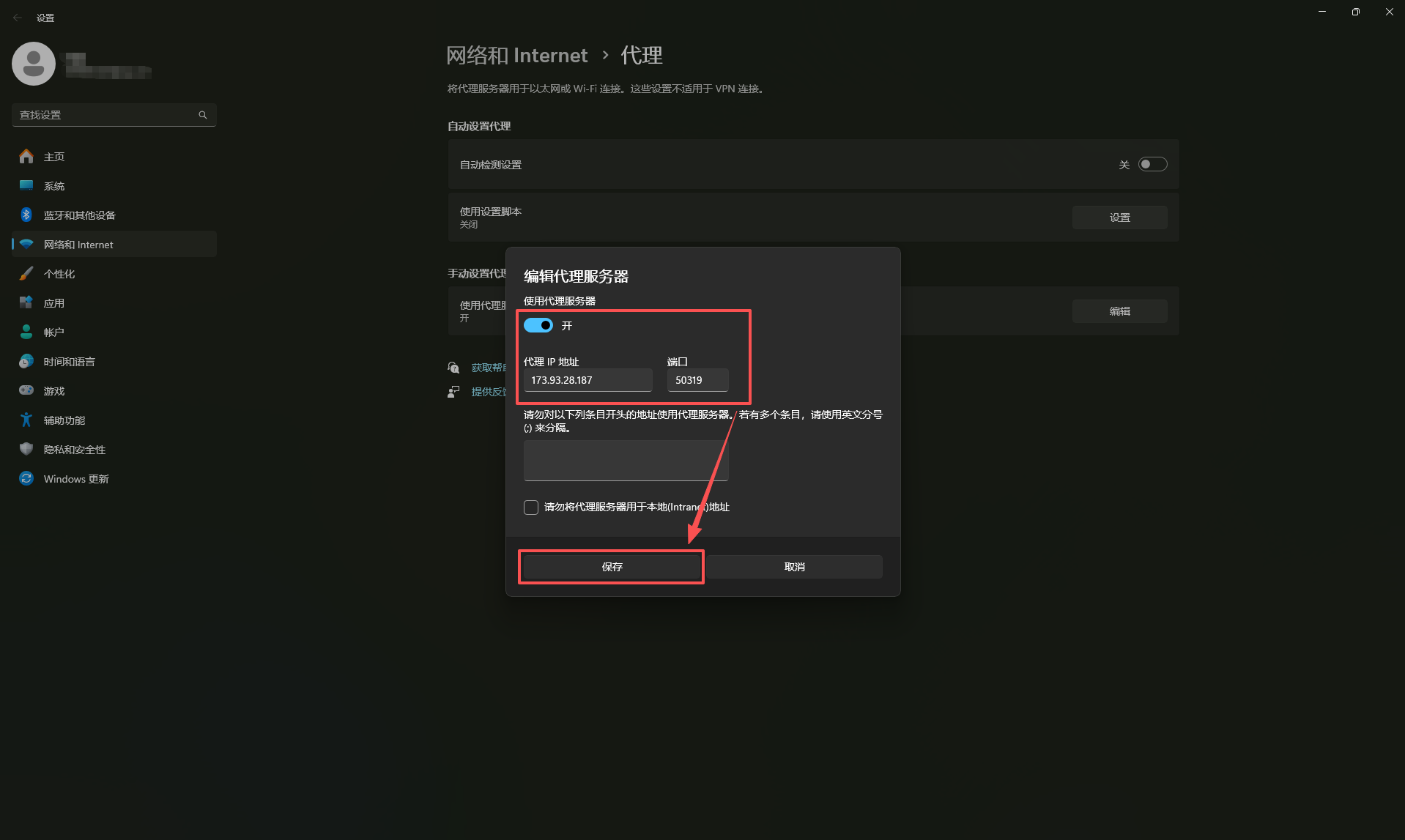 b. 填写IP地址与端口:开启【使用代理服务器】,把在神龙海外购买的代理地址、代理端口填写至相应字段,填写完成后保存,即可完成代理配置