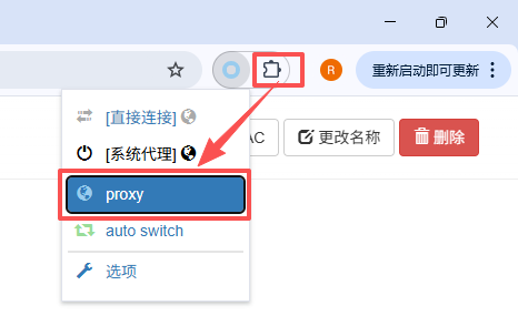③ 启用代理:点击谷歌浏览器右上角【扩展程序】,选择SwitchyOmega插件,并切换至刚刚配置的代理模式【proxy】,即可通过神龙海外代理进行业务访问了