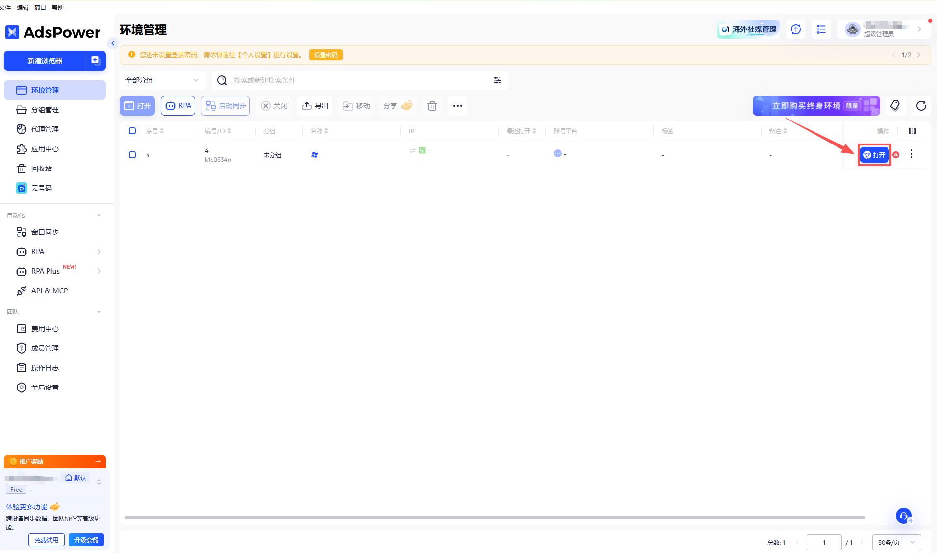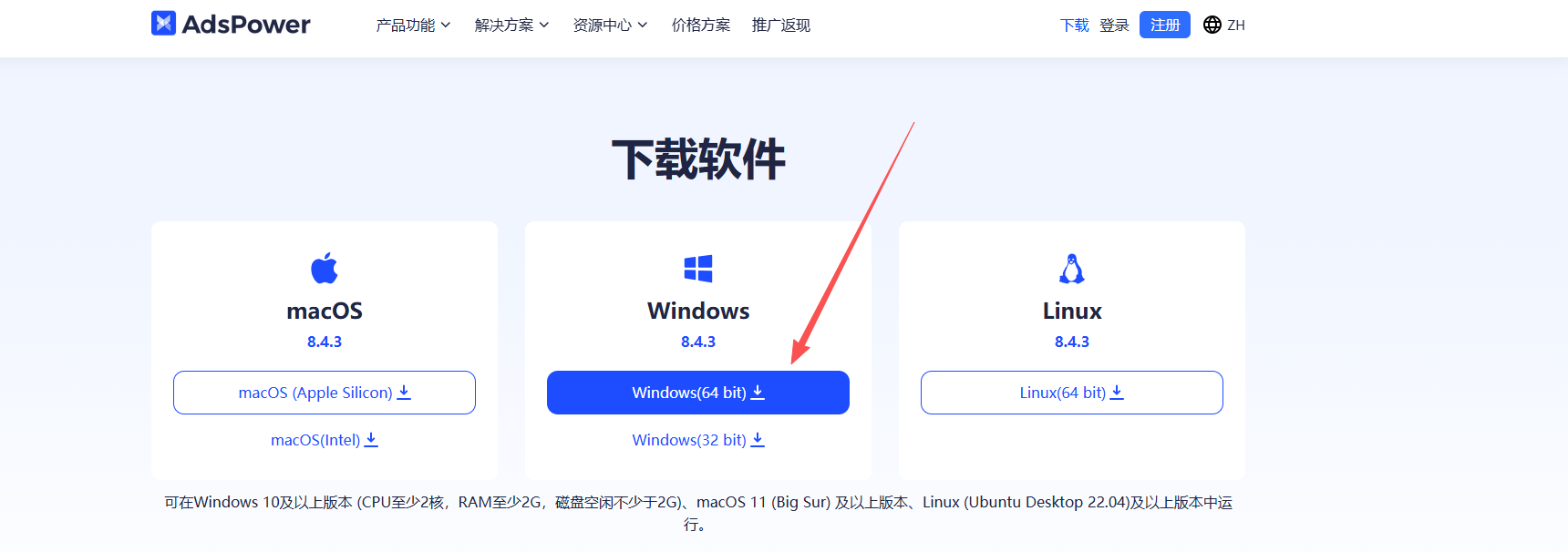 打开Adspower官网,选择对应的系统版本进行下载安装,安装完成后注册登录即可(本文以Windows系统为例)