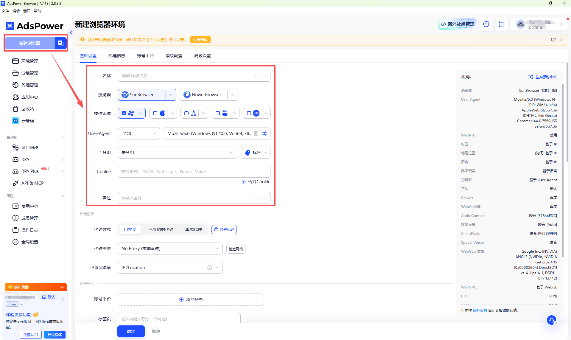 在准备好可用的海外网络环境、神龙海外的代理连接信息后,即可开始进行指纹浏览器配置